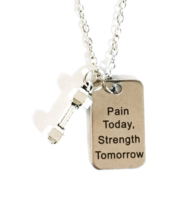 Fitness Quote Necklace, Dumbbell Charm, Fitness Jewelry, Pain Today Strength Tomorrow, Inspirational Charm Necklace, Workout Gift for Her