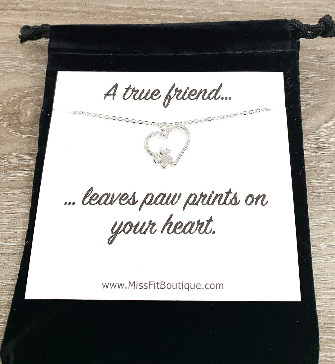 Paw Print Heart Necklace, Dainty Paw Pendant Silver, Minimal Pet Jewelry, Cat Lover Gift, Dog Owner Gift, Paw Prints on your Heart Quote