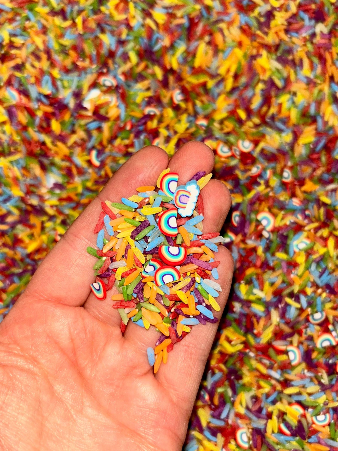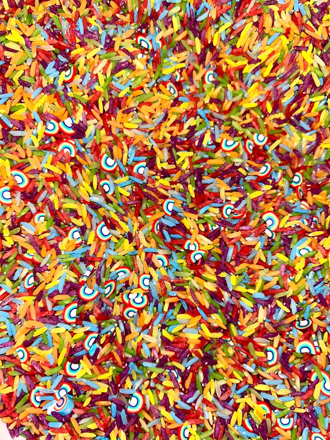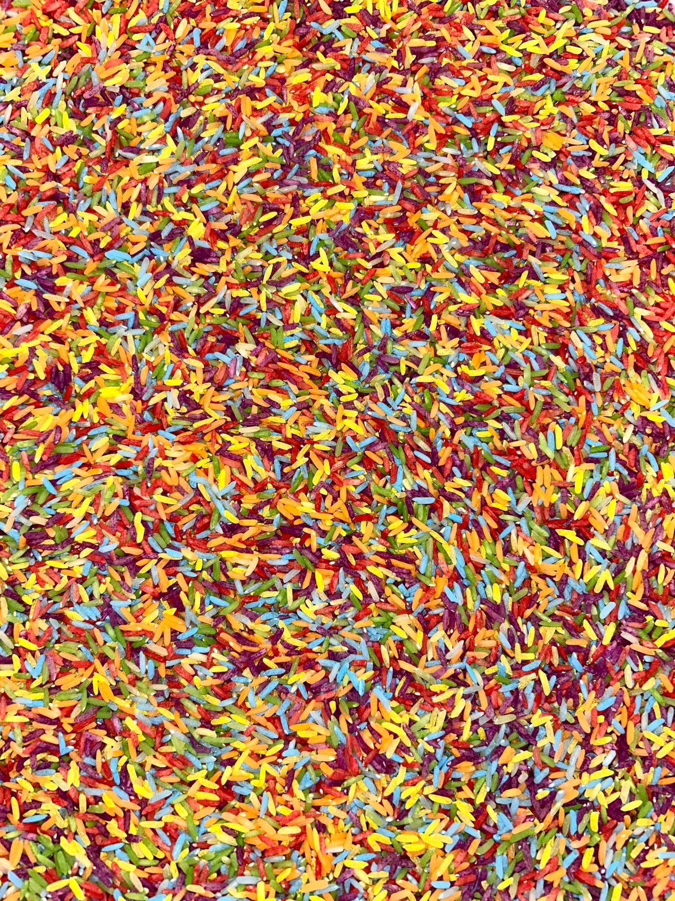 - Hand-dyed rainbow rice (red, orange, yellow, green, blue, purple)