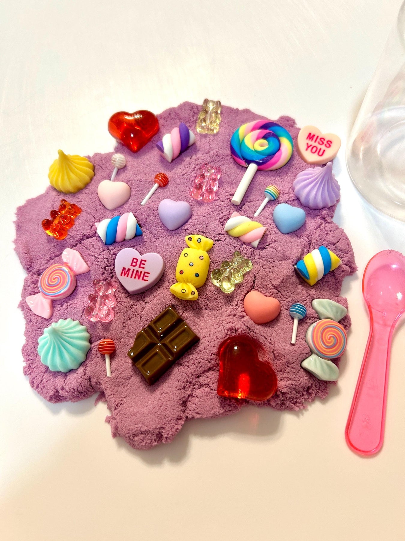 Candy-Themed Kinetic Sand Kit for Kids | Valentine’s Day Sensory Play | Pink, Red & Purple Colors | Charms Included