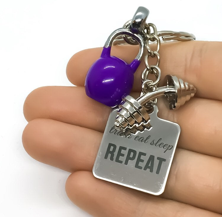 Porte-clés de gym, Entraîne-toi, mange, dors, recommence, Citation fitness, Breloque kettlebell, Porte-clés motivationnel, Cadeau pour coach sportif, Cadeau pour entraîneur personnel