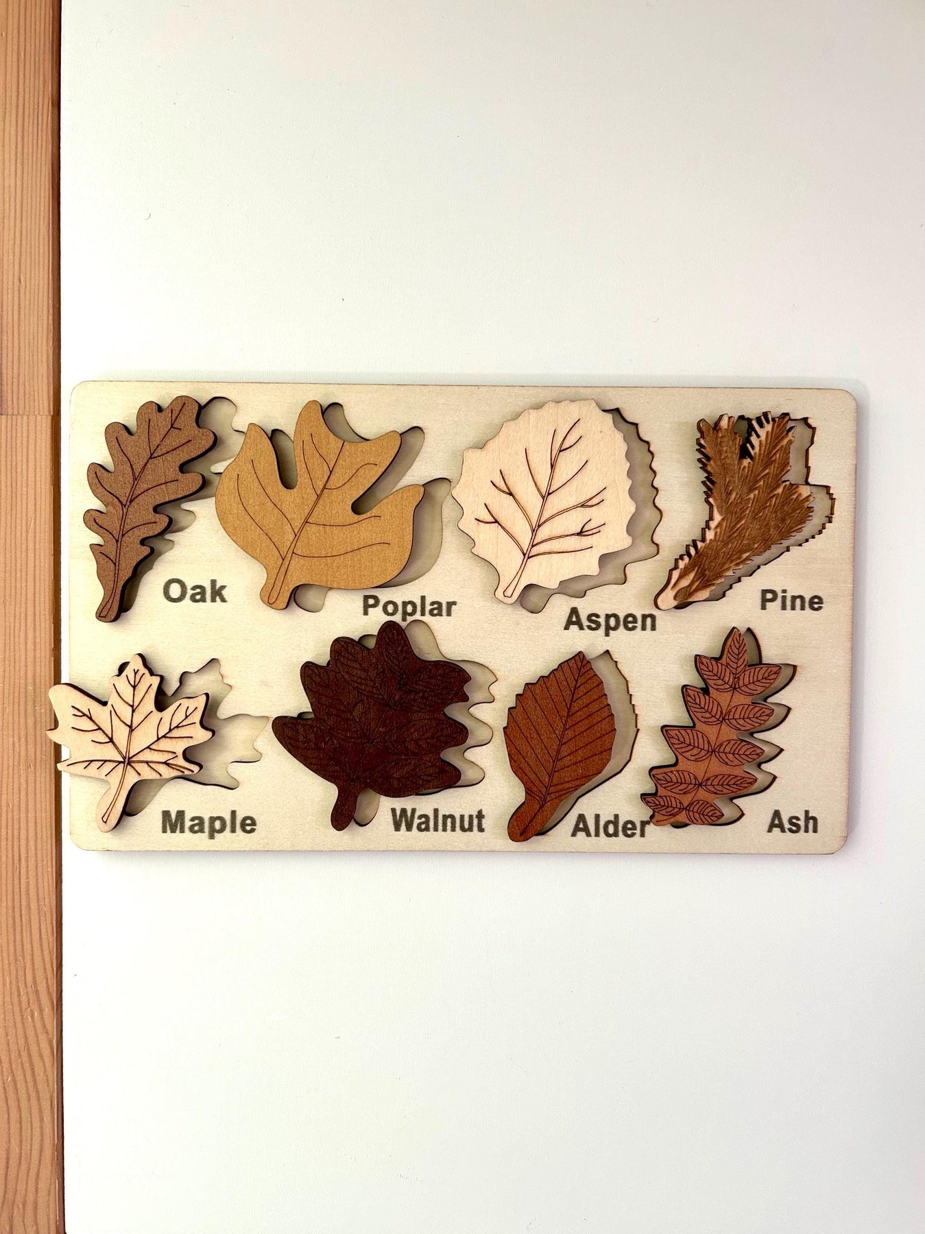 Woodland Leaf Identification Puzzle | Montessori Fine Motor Wooden Board | Handcrafted Wood Nature Toy | Fall Learning Gift for Kids