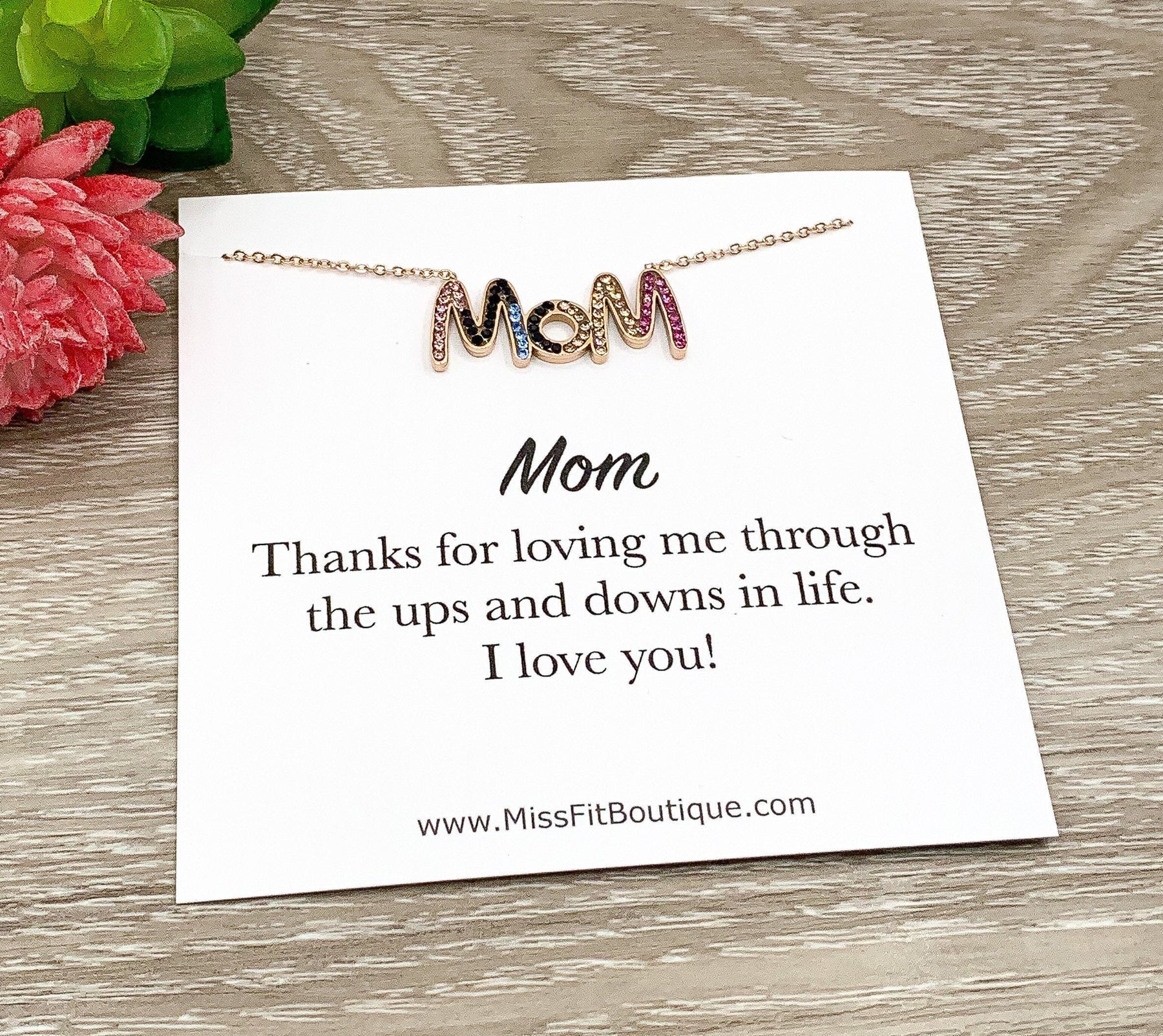 MOM Necklace, Thank You Mom Quote Card, Rhinestones, Mom Jewelry, Layering Necklace, Dainty Jewelry, Gift from Daughter, Gift from Kids