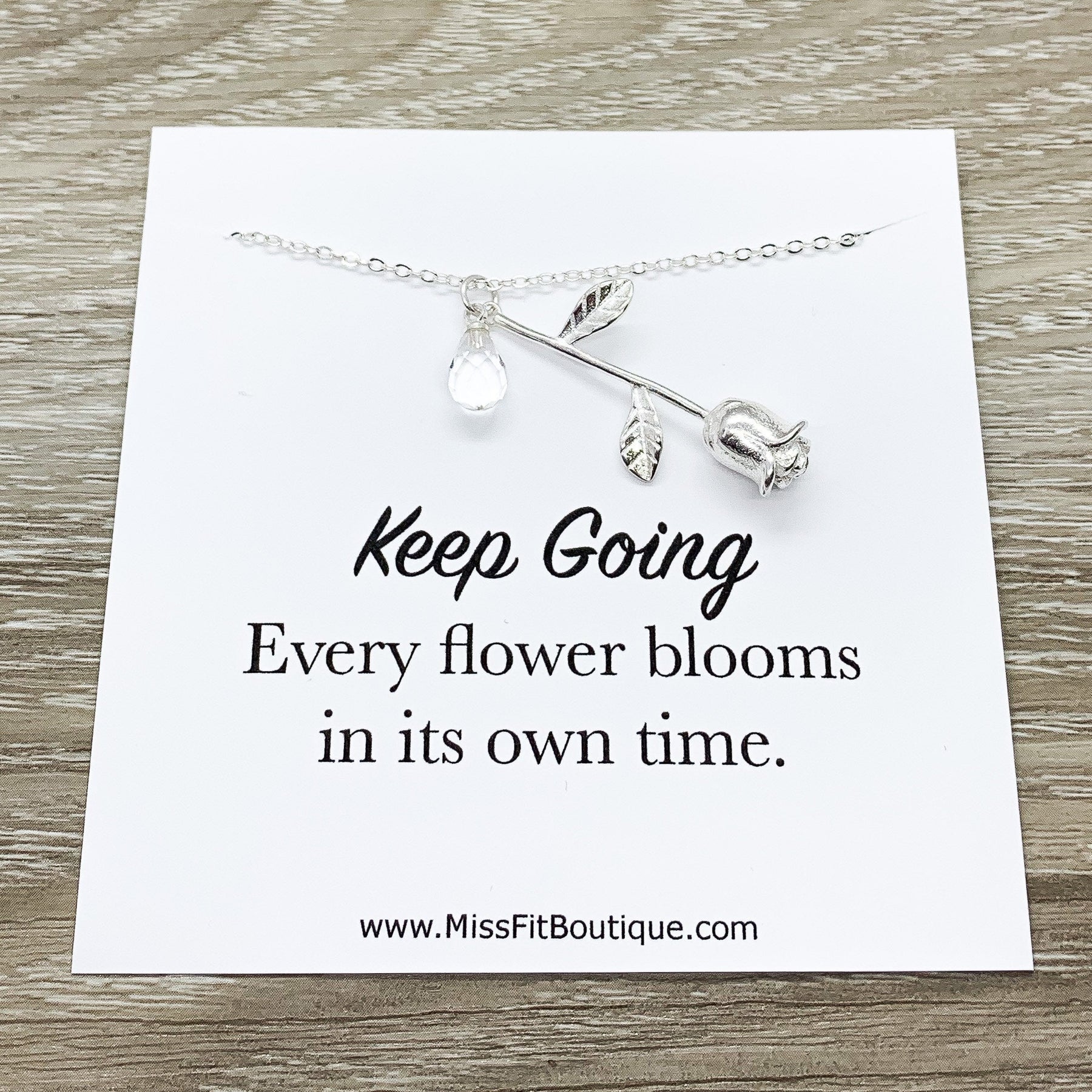 Collier rose, bijou floral en argent sterling, carte « Continue comme ça », bijou floral, cadeau réconfortant, cadeau d'une amie, cadeau symbolique pour elle