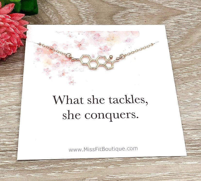 Estrogen Necklace, What She Tackles, She Conquers Quote, Affirmation Gift, Molecular Jewelry, Empowering Gift, Feminist Jewelry, Friendship