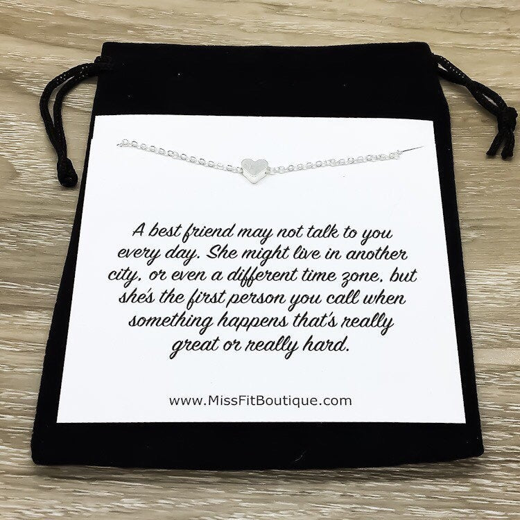 Long Distance Friends Necklace, Tiny Silver Heart Necklace, Gift for BFF, Dainty Jewelry, Friendship Necklace, Meaningful Card, Thoughtful